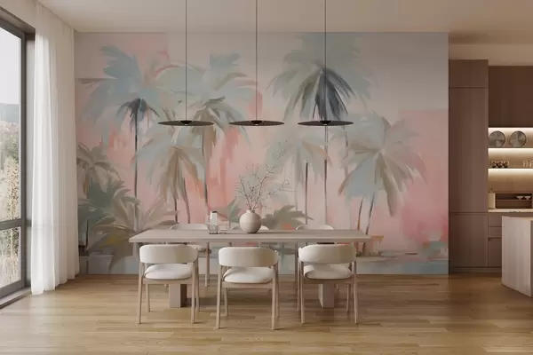 Fototapet Abstract minimalist pastel palmieri tropicali, pe un fundal de nuanțe moi de roz și piersică Nr. w09212