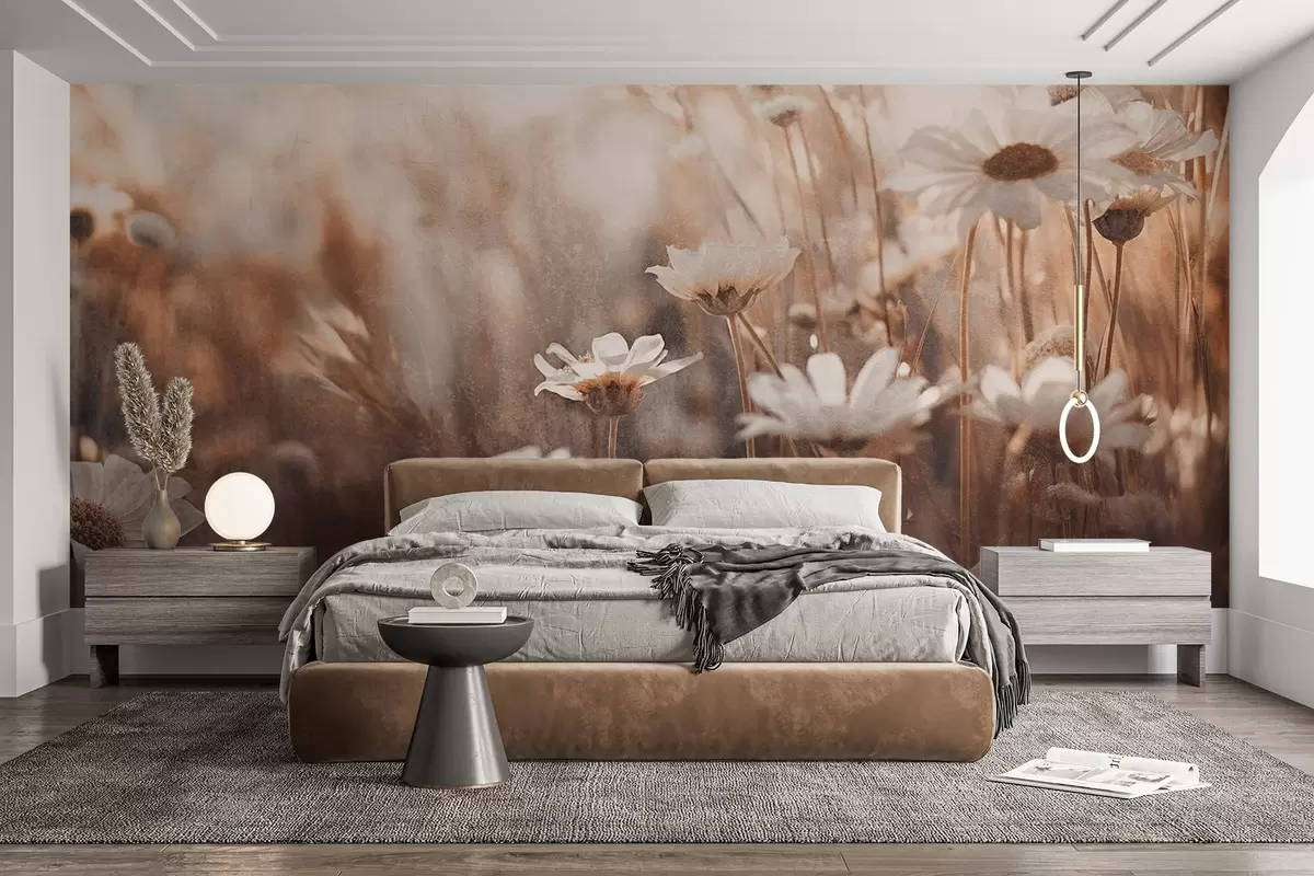 Fototapet Câmp texturat de margarete albe și flori sălbatice în paleta de culori calde cu fundal încețoșat Nr. w09214