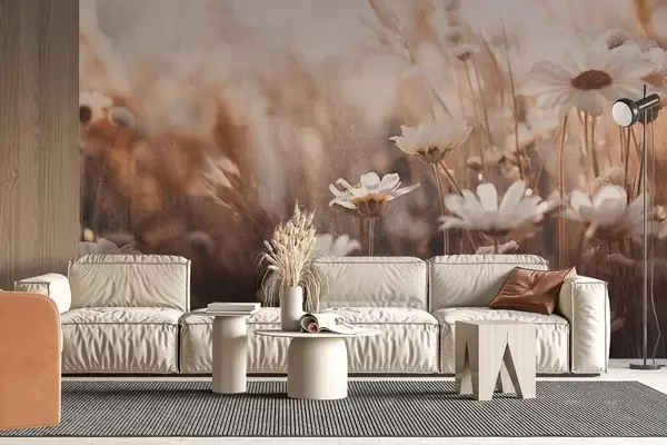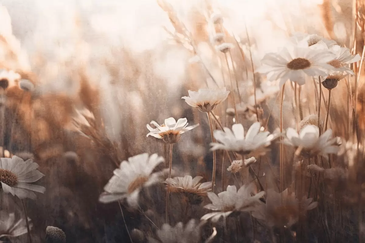 Fototapet Câmp texturat de margarete albe și flori sălbatice în paleta de culori calde cu fundal încețoșat Nr. w09214