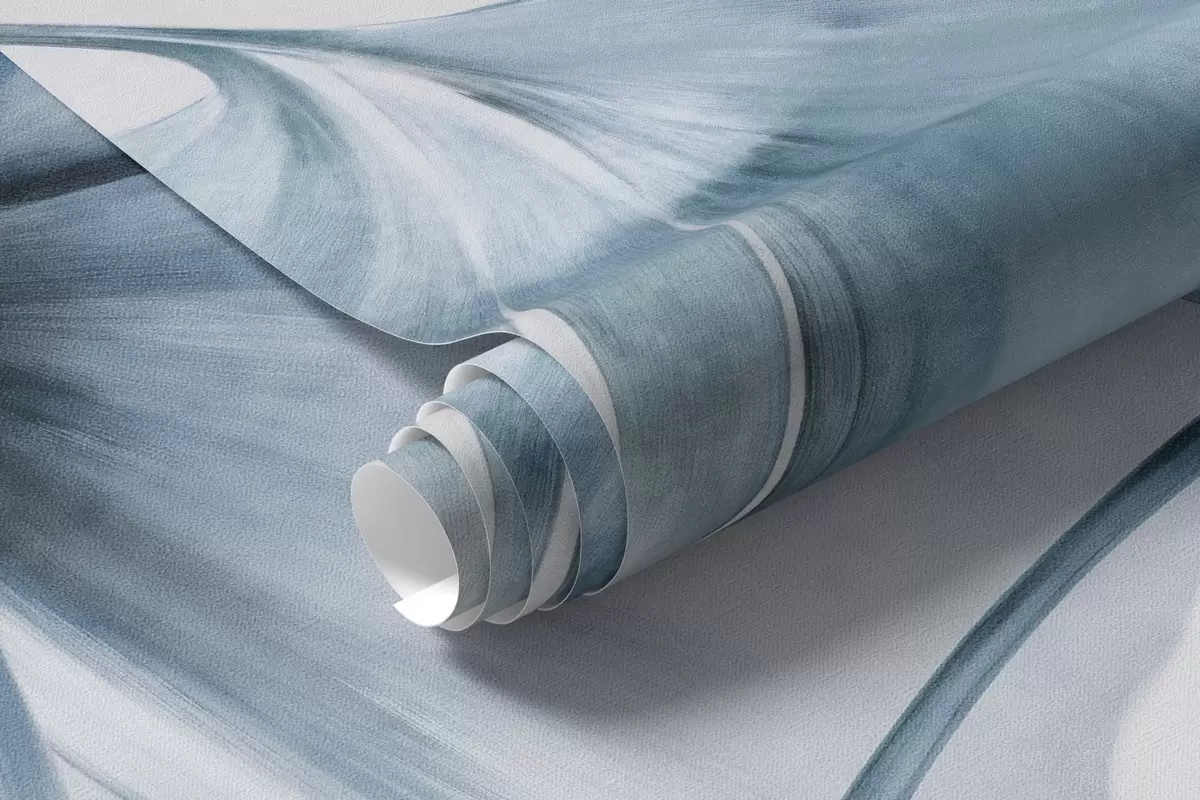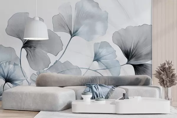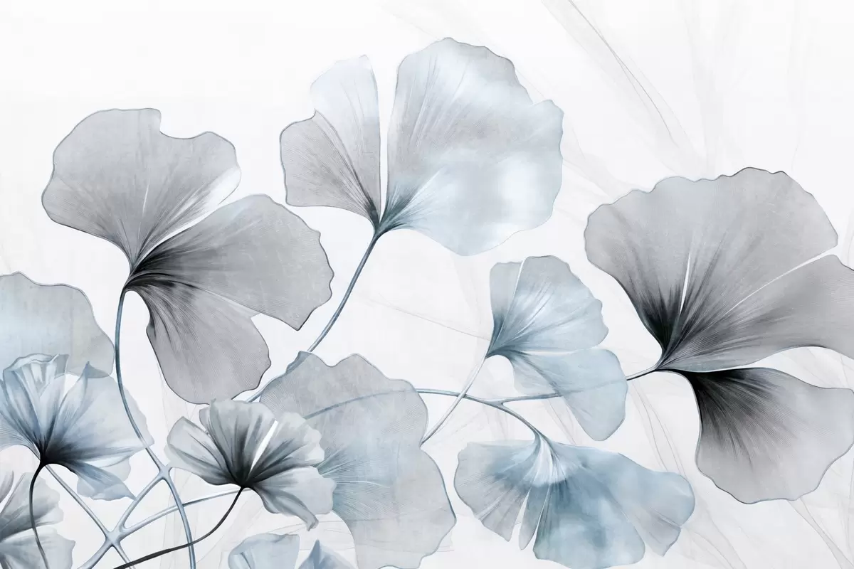 Fototapet Ginkgo biloba frunze în tonuri de albastru și gri, efect de acuarelă cu textură delicată, fundal deschis Nr. w09215v1