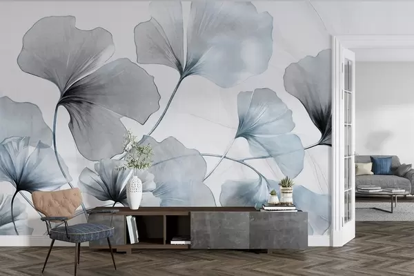 Fototapet Ginkgo biloba frunze în tonuri de albastru și gri, efect de acuarelă cu textură delicată, fundal deschis Nr. w09215v1