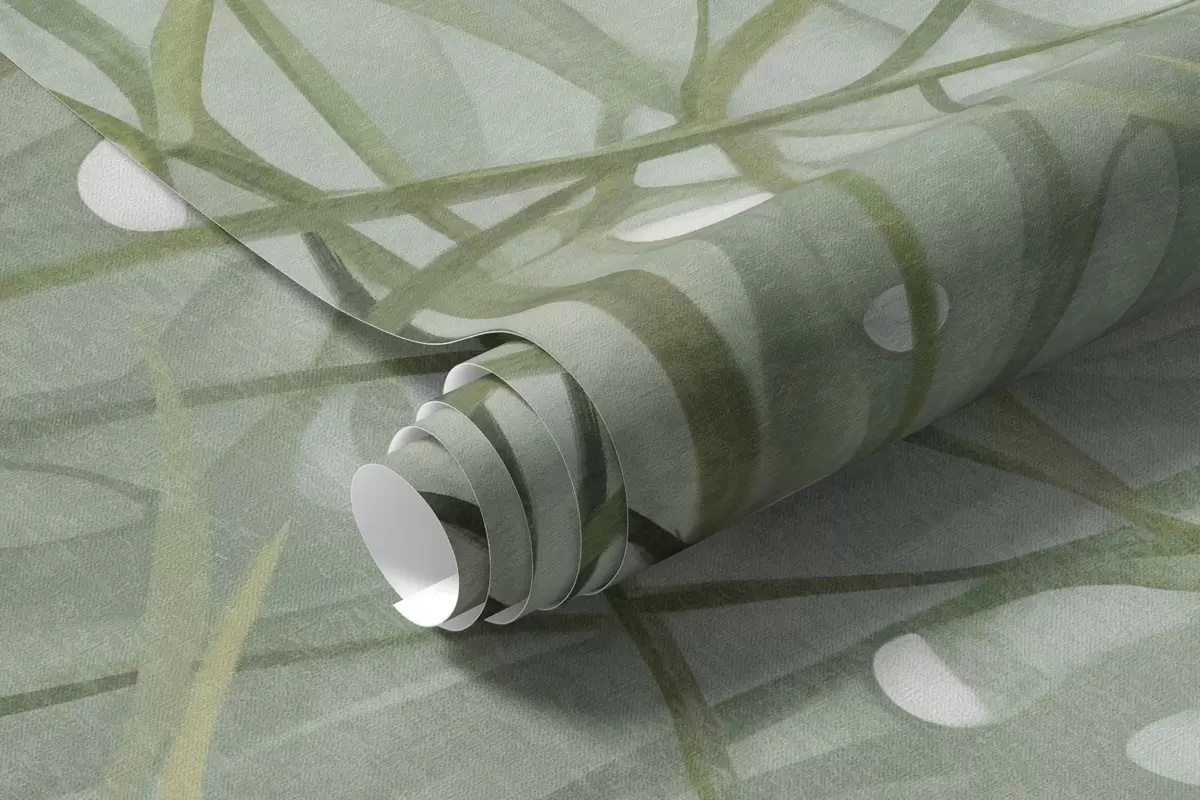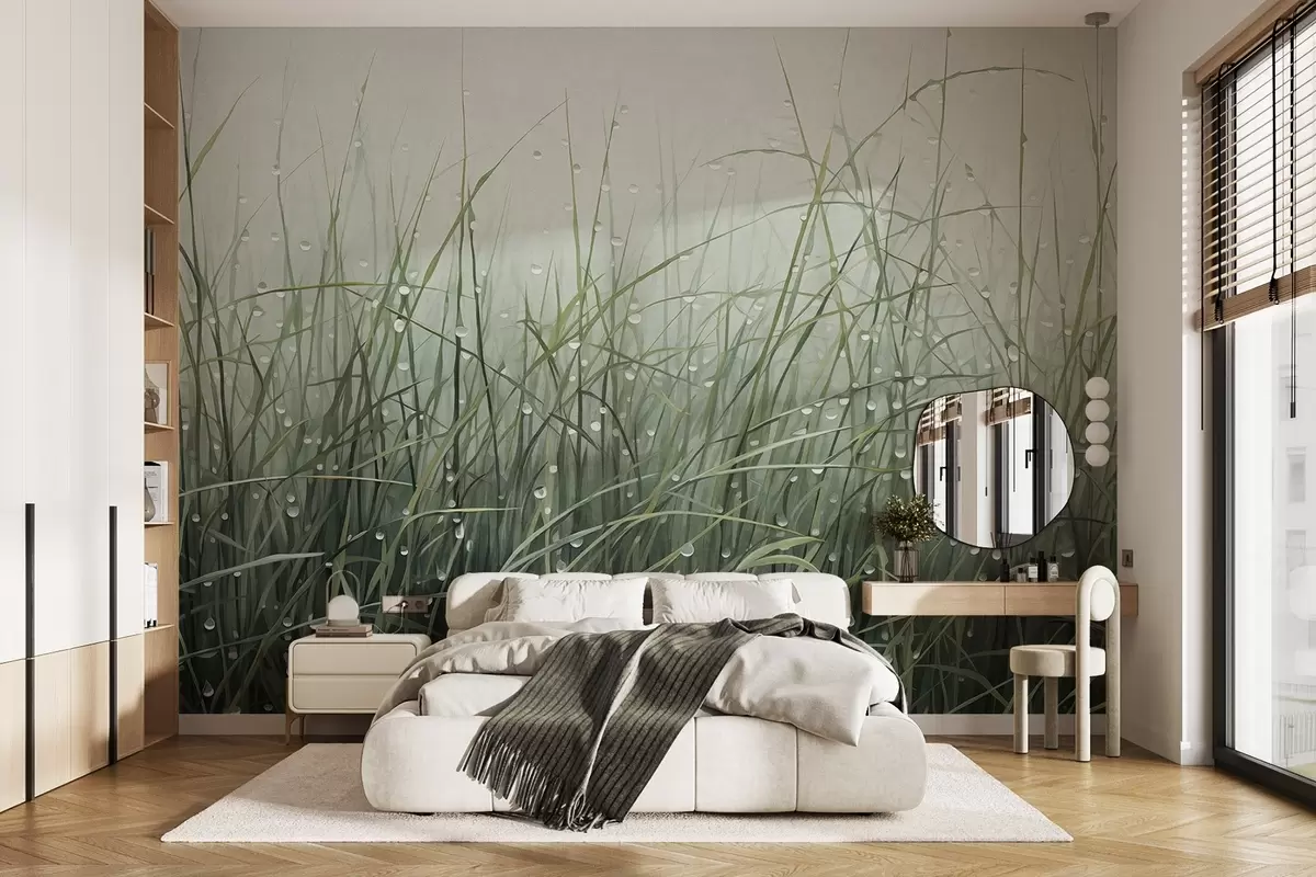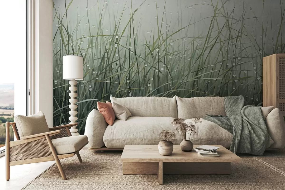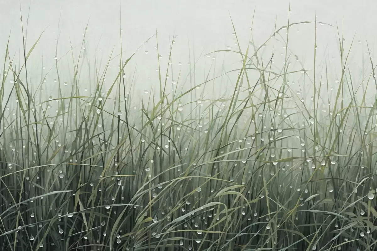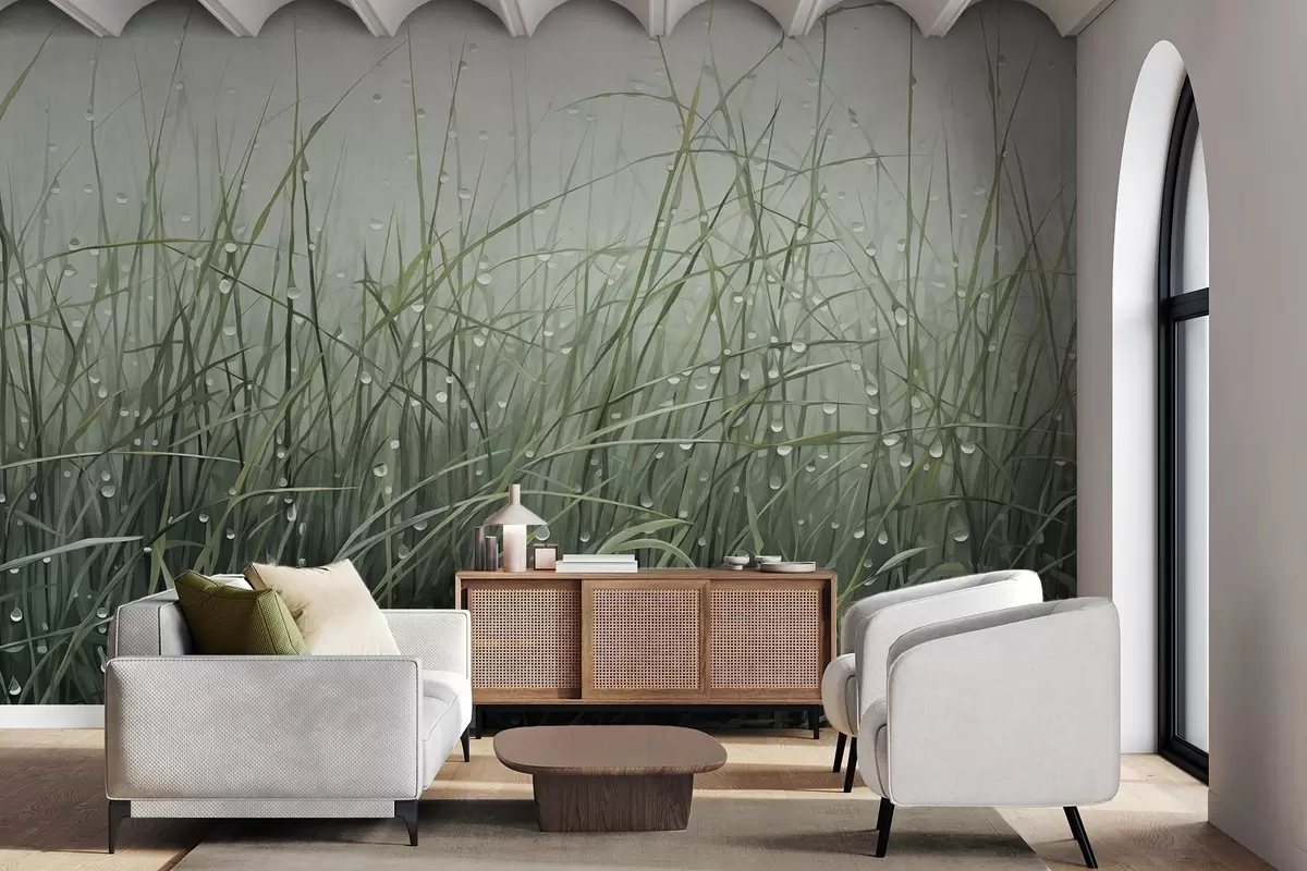 Fototapet Iarbă cu picături de apă, nuanțe de verde stins, lumină moale, fundal cețos, stil abstract minimalist texturat Nr. w09217