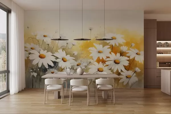 Fototapet Un câmp de margarete albe cu centre galbene, pe un fundal galben și bej moale, stil acuarelă Nr. w09218