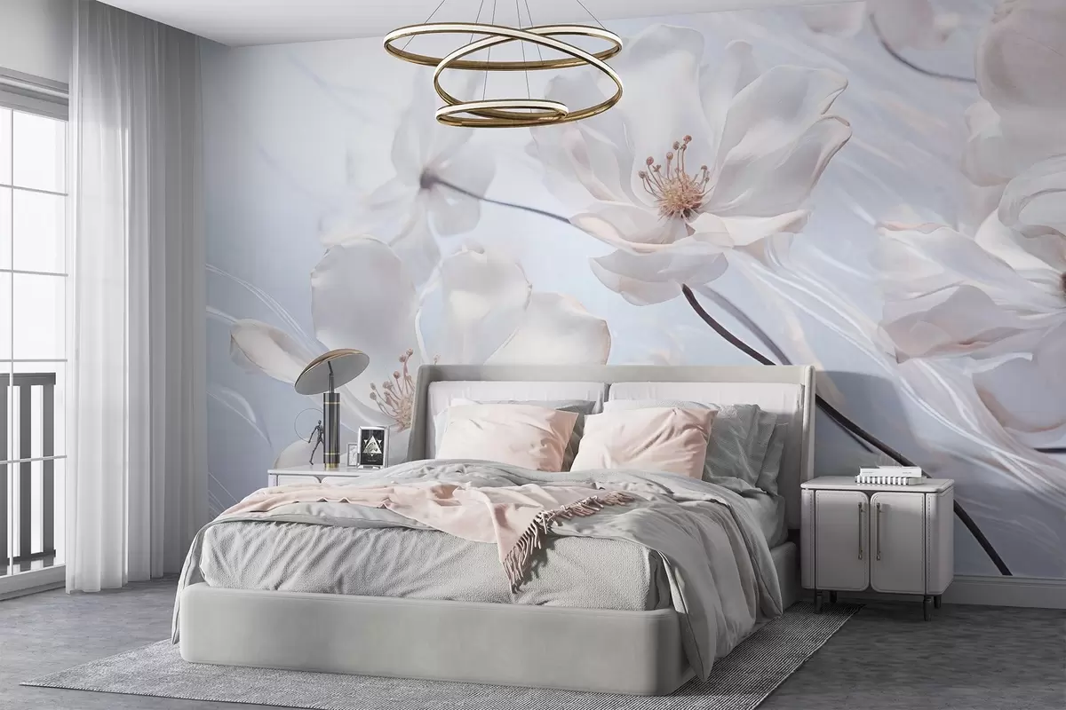 Fototapet Flori albe transparente texturate cu petale delicate, fundal albastru deschis moale, elegant, romantic, visător Nr. w09233