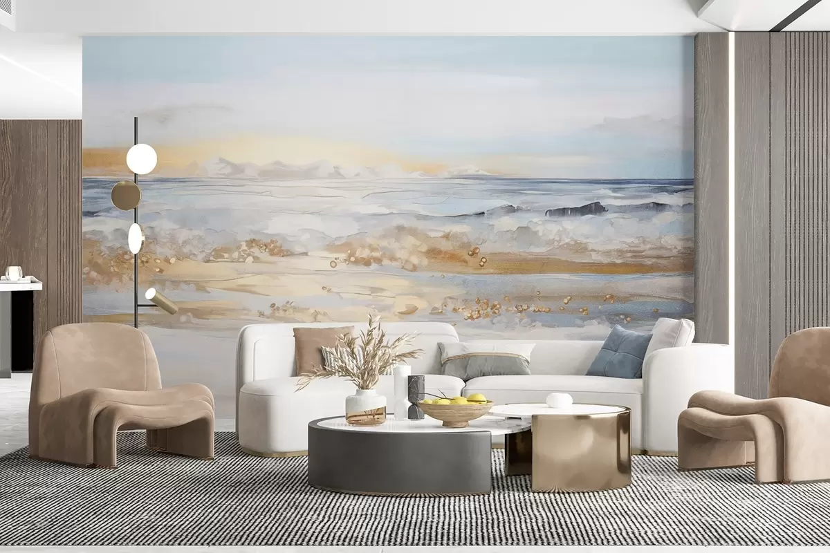 Fototapet Abstract texturat peisaj ocean valuri crashing pe o plajă de nisip, culori pastelate moi, cer albastru cu nori de lumină Nr. w09234
