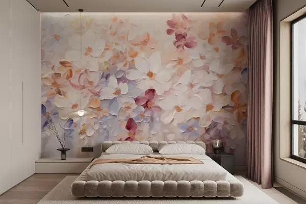 Fototapet Imitație de pictură în ulei a unei grădini de flori cu flori albe, roz și portocalii, tușe moi, culori pastelate atenuate Nr. w09236
