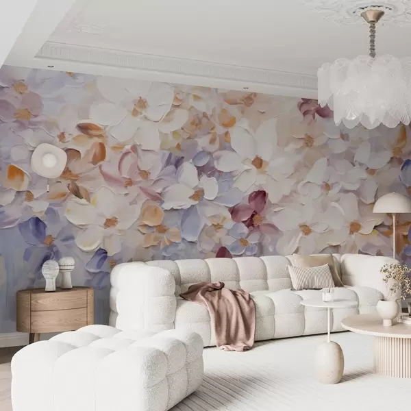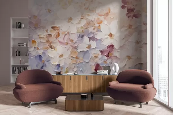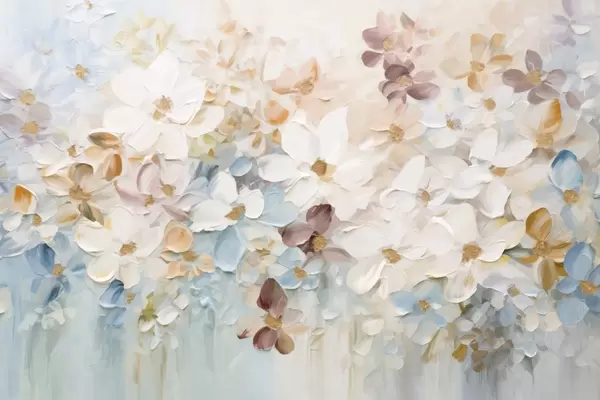 Fototapet Imitație de pictură în ulei a unei grădini de flori cu flori albe, roz și portocalii, tușe moi, culori pastelate atenuate Nr. w09236