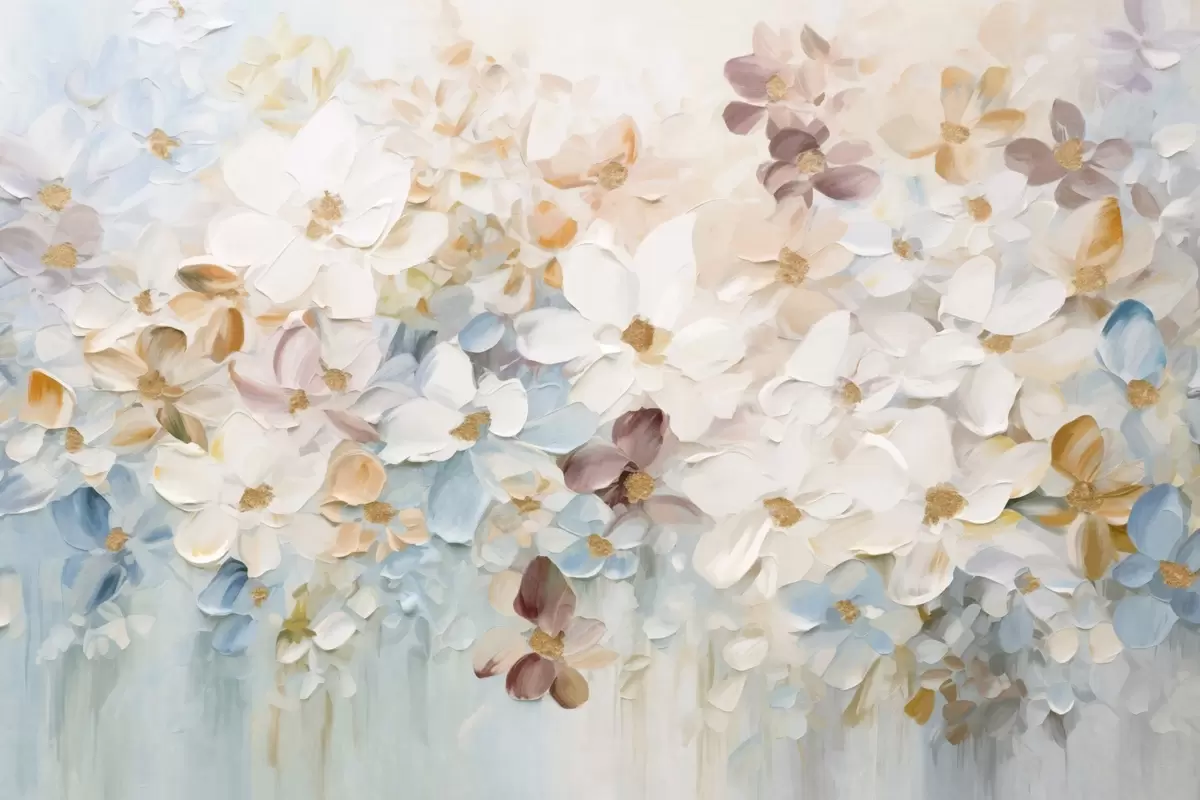 Fototapet Imitație de pictură în ulei a unei grădini de flori cu flori albe, albastre și portocalii, tușe moi, culori pastelate atenuate Nr. w09236v1
