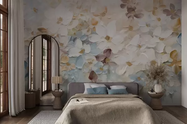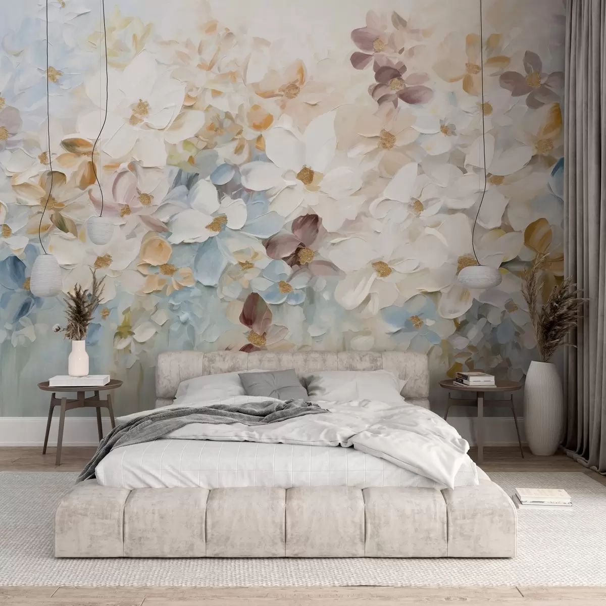 Fototapet Imitație de pictură în ulei a unei grădini de flori cu flori albe, albastre și portocalii, tușe moi, culori pastelate atenuate Nr. w09236v1