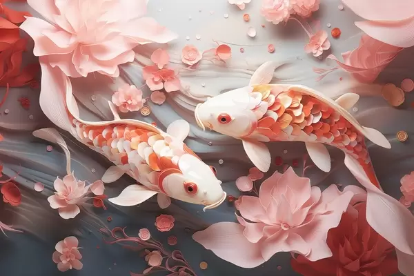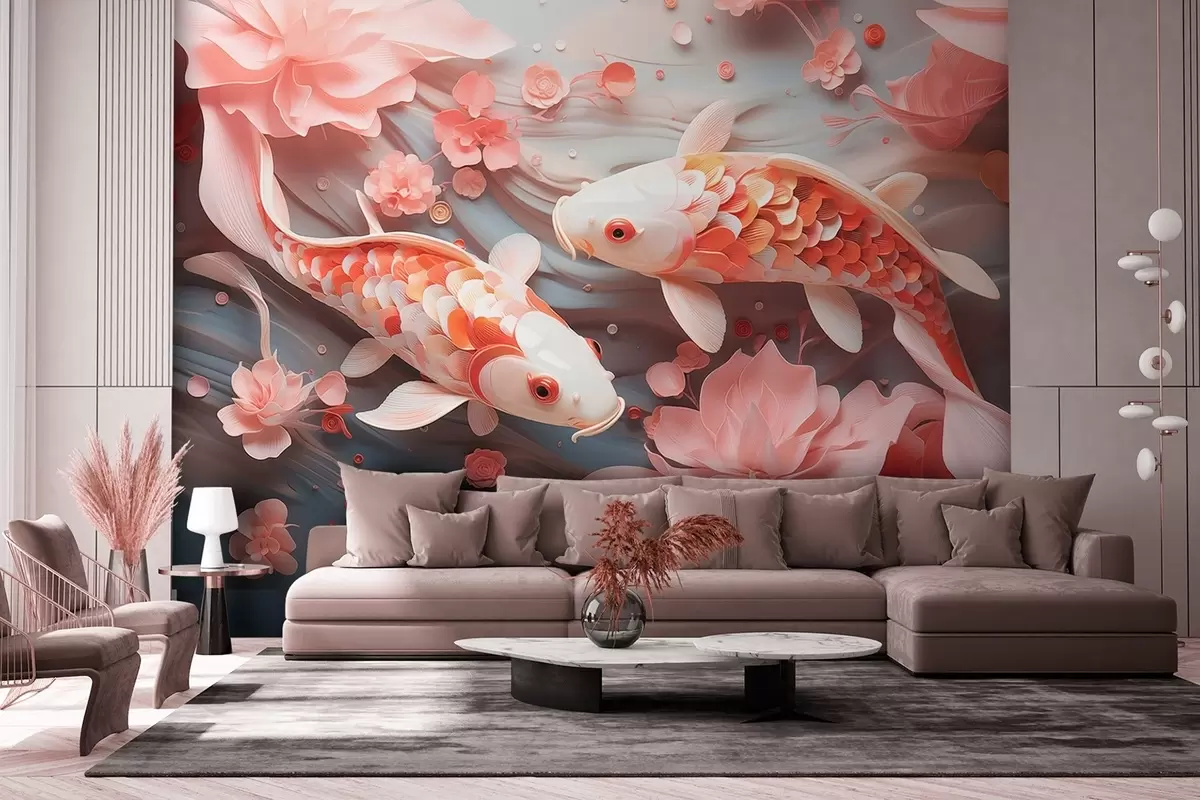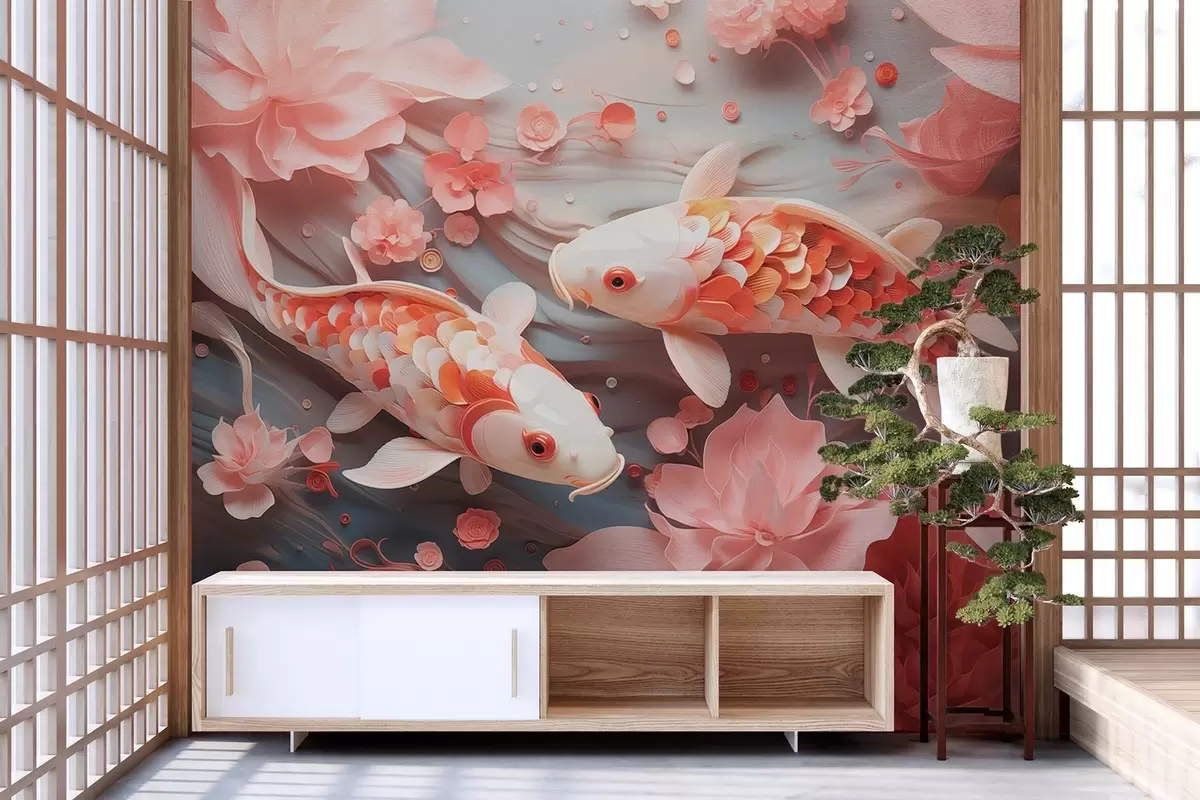 Fototapet Pești delicați cu solzi tridimensionali înoată printr-un flux de petale și tonuri roz blând Nr. w09237