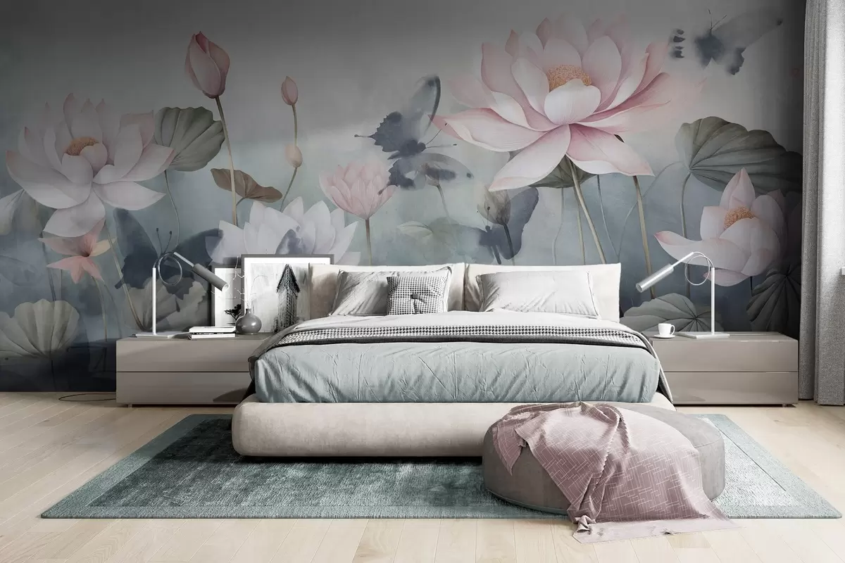 Fototapet Lotus flori texturate cu petale roz pastel, frunze verzi, reflecție de apă, culori pastelate moi, efect de acuarelă Nr. w09254