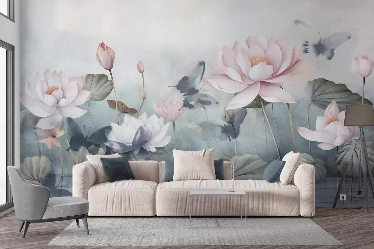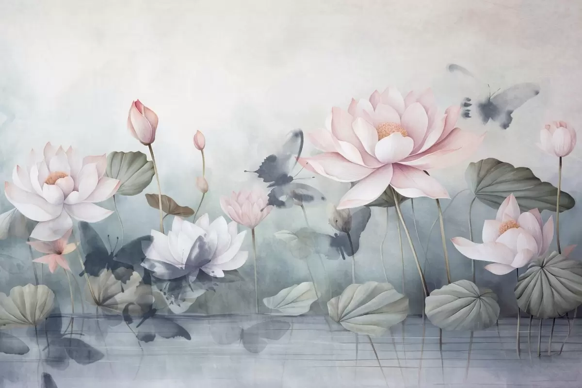 Fototapet Lotus flori texturate cu petale roz pastel, frunze verzi, reflecție de apă, culori pastelate moi, efect de acuarelă Nr. w09254
