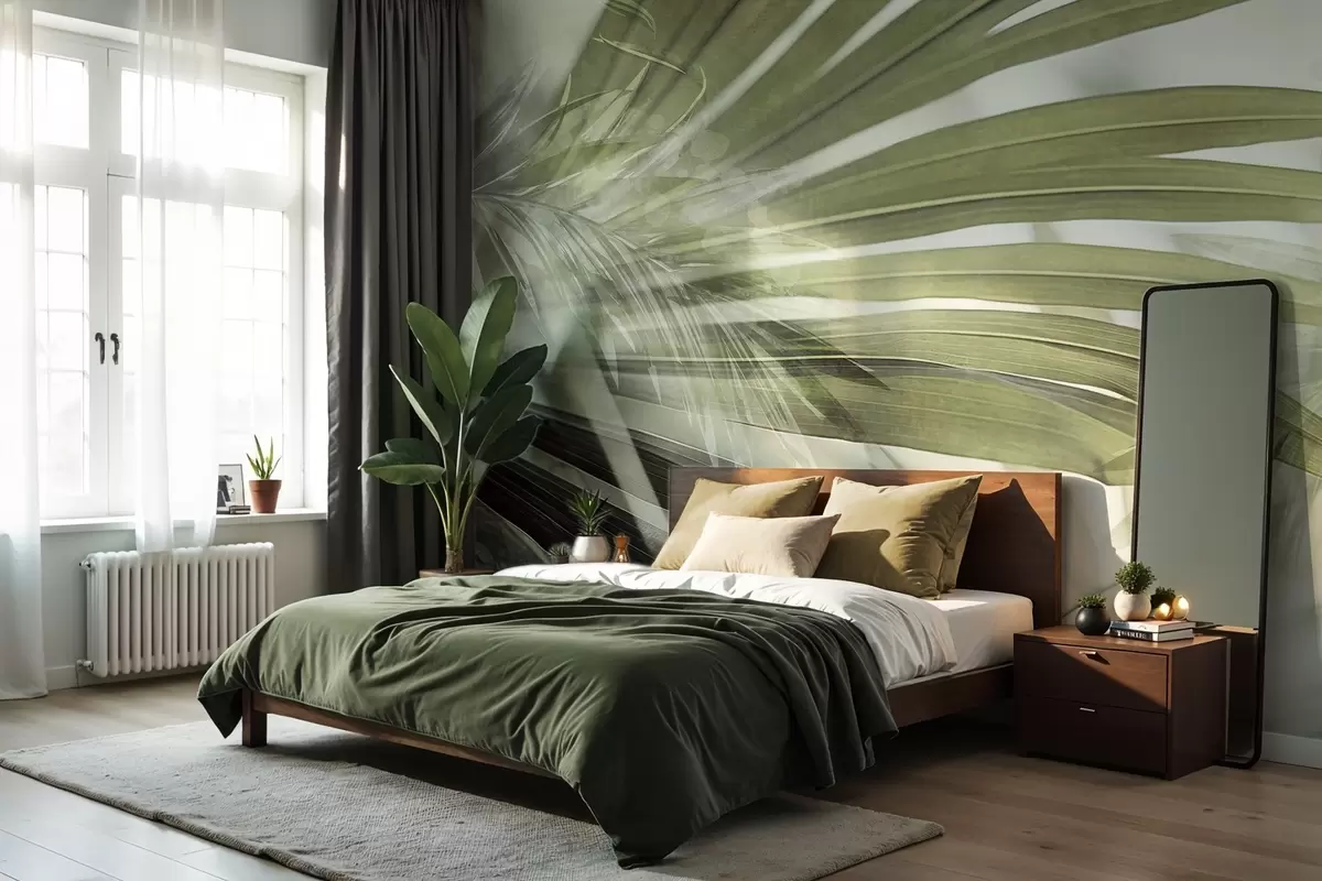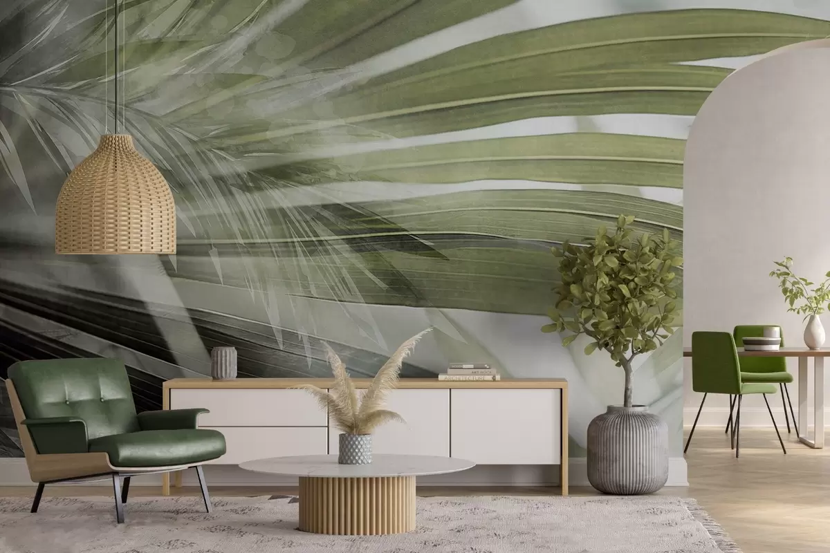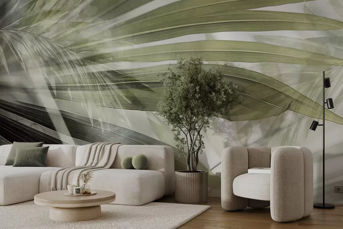 Fototapet Frunze de palmier cu o nuanță verde deschis, suprapuse și creând un efect stratificat, pe un fundal moale, neutru Nr. w09256v1