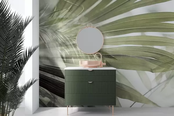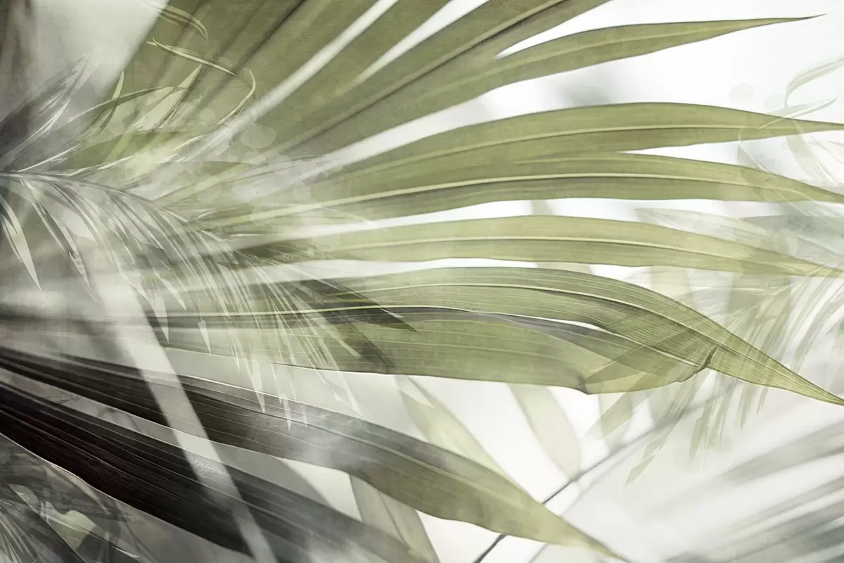 Fototapet Frunze de palmier cu o nuanță verde deschis, suprapuse și creând un efect stratificat, pe un fundal moale, neutru Nr. w09256v1