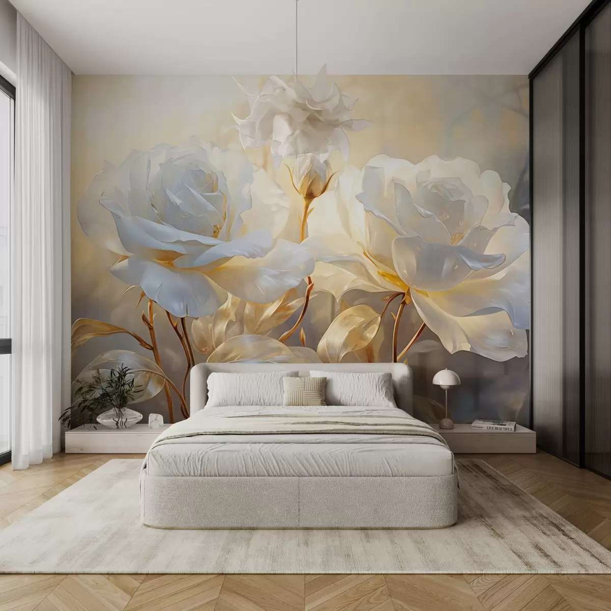 Fototapet Trandafiri albi texturați cu tulpini și frunze galbene, iluminare moale, fundal luminos cu forme florale neclare Nr. w09258