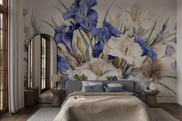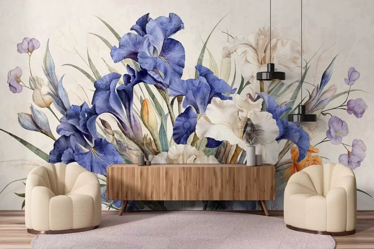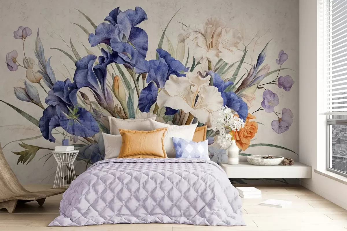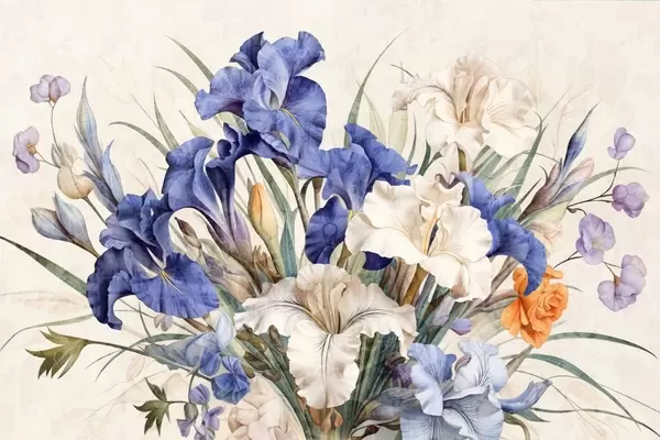 Fototapet Buchet vintage texturat de iriși mov, aranjat cu frunze și tulpini verzi, pe un fundal moale Nr. w09263