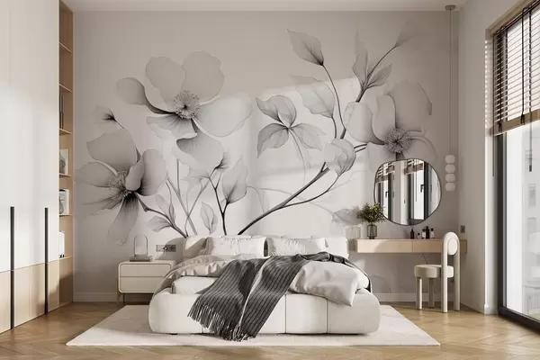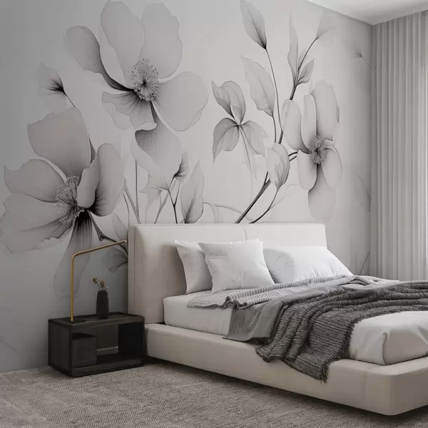 Fototapet Flori albe și negre cu linii elegante pe un fundal gri Nr. w09271