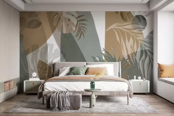 Fototapet Frunze Monstera și frunze de palmier într-un model cu culori maro, alb și verde, vibe tropical, forme abstracte, decorative Nr. w09288