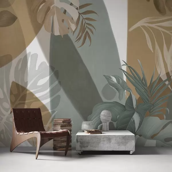 Fototapet Frunze Monstera și frunze de palmier într-un model cu culori maro, alb și verde, vibe tropical, forme abstracte, decorative Nr. w09288