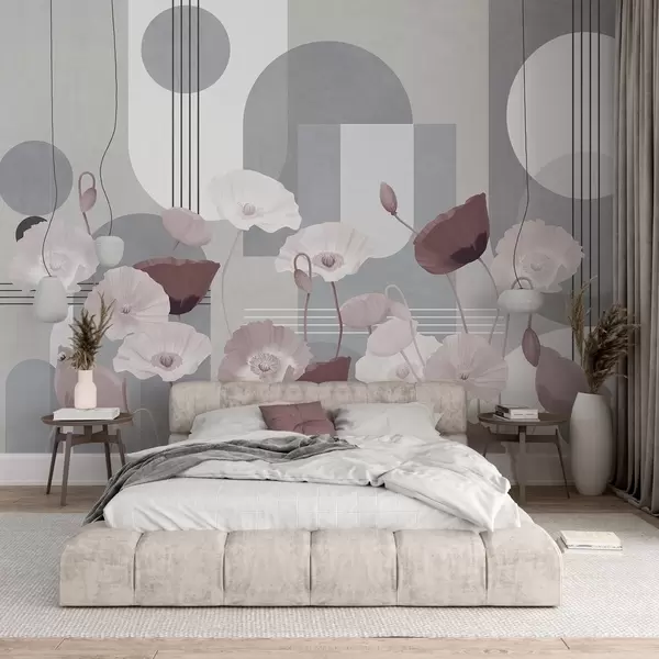 Fototapet Mac în culori albe și gri cu forme geometrice în fundal, cercuri și arcuri, stil minimalist, culori moi Nr. w09289v1