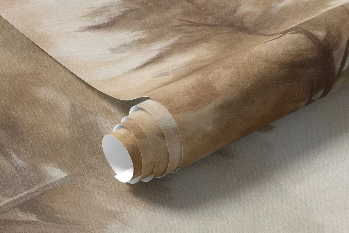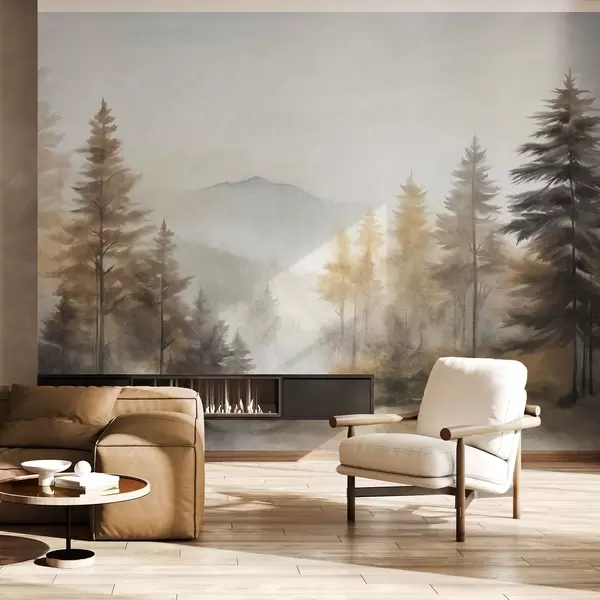 Fototapet Pădure de toamnă texturată cu pini înalți și munți în fundal, culorile sunt mute și stilul de pictură pământesc Nr. w09290
