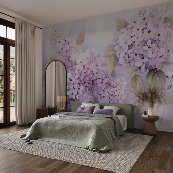 Fototapet Flori lila texturate cu petale violet deschis, frunze verde deschis, stil acuarelă, culori moi, pastelate, tușe delicate Nr. w09291