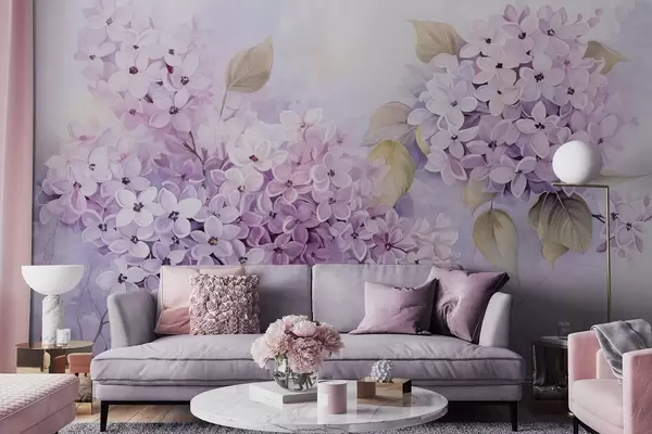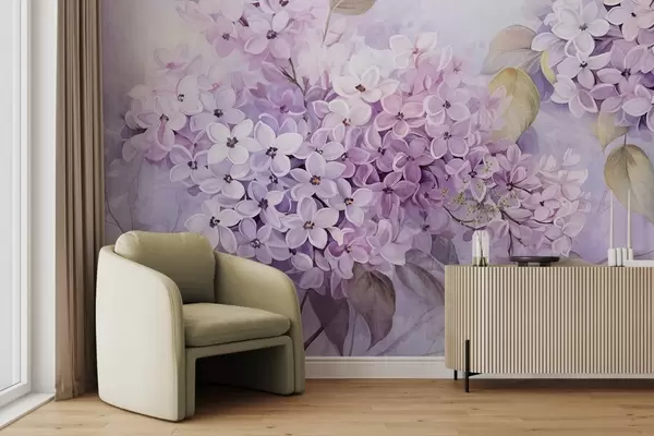 Fototapet Flori lila texturate cu petale violet deschis, frunze verde deschis, stil acuarelă, culori moi, pastelate, tușe delicate Nr. w09291