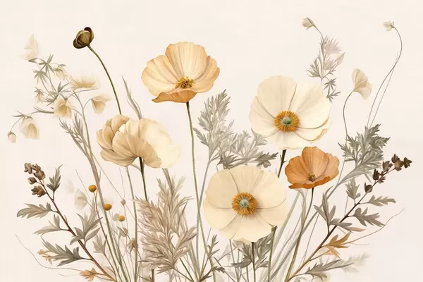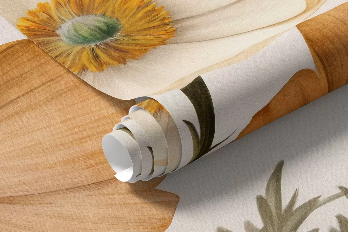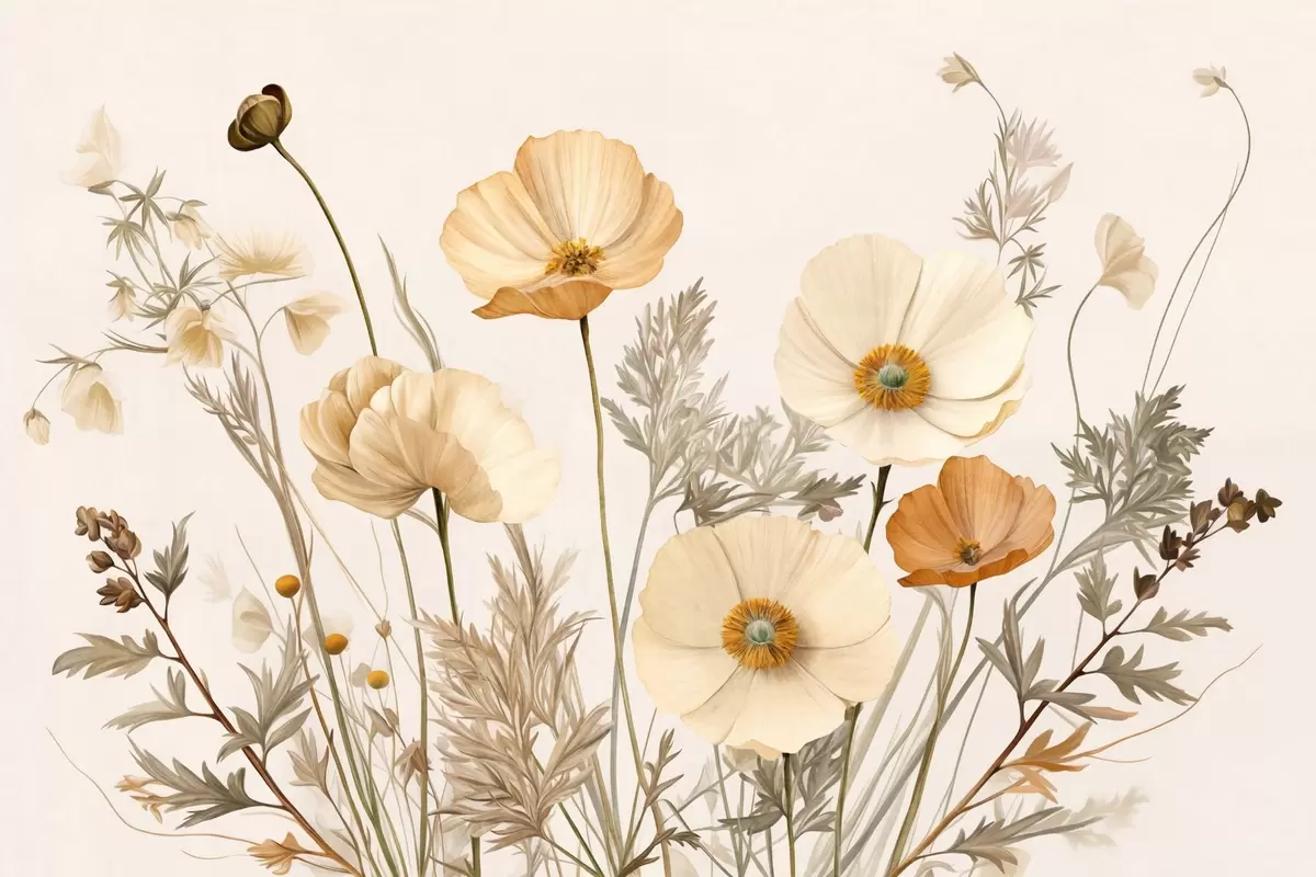 Fototapet Portocaliu și alb vintage texturat maci cu tulpini subțiri și frunze, fundal bej deschis, stil acuarelă Nr. w09293