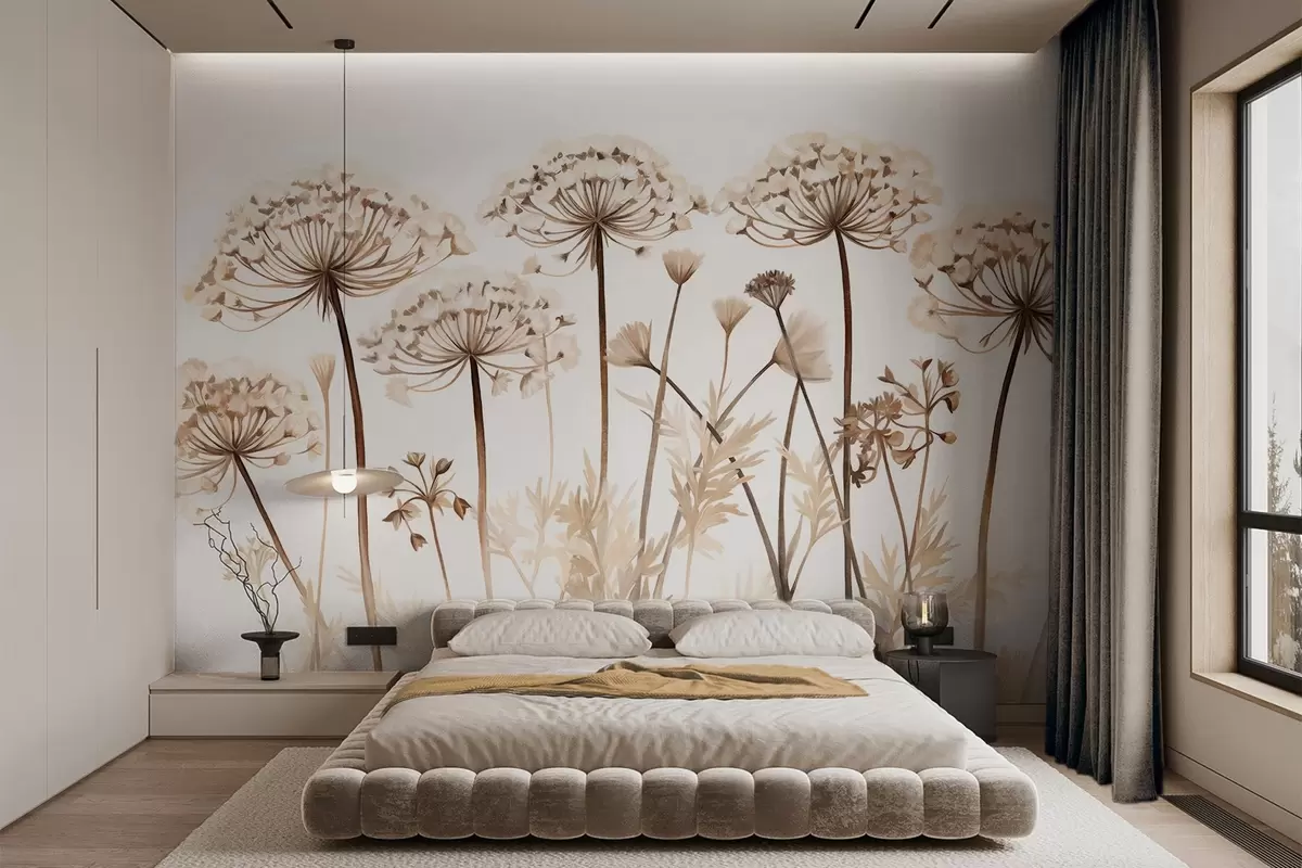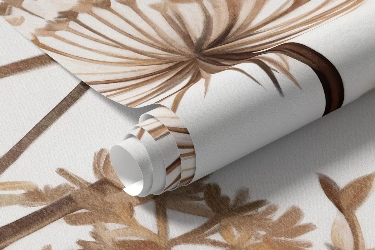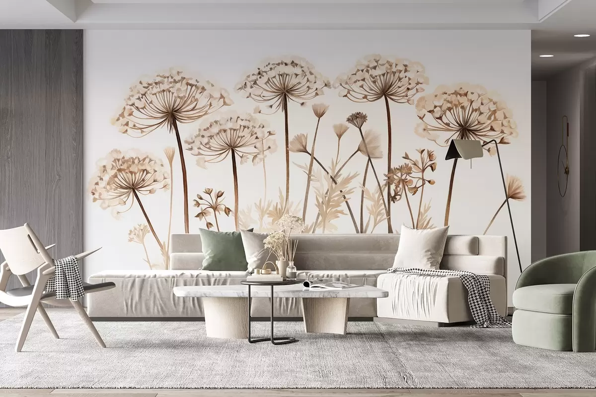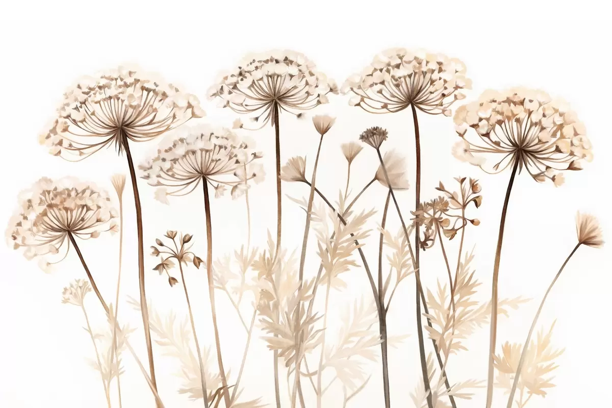 Fototapet Flori de dantelă Queen Anne într-un câmp, imitație de pictură texturată, paletă de culori maro, bej și alb, ilustrație botanică Nr. w09294