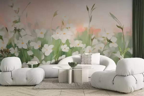 Fototapet Câmp abstract de flori sălbatice cu tulpini și frunze verzi, pe fundalul unui cer texturat, de un roz pal și alb. Nr. w09297