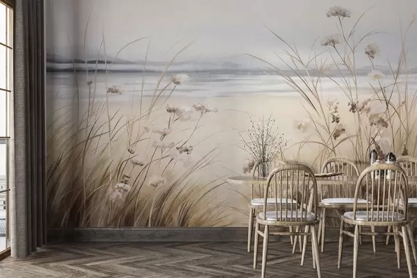 Fototapet Un câmp de grâu cu flori albe în prim-plan, o plajă și oceanul în fundal, culori pastelate neutre Nr. w09298