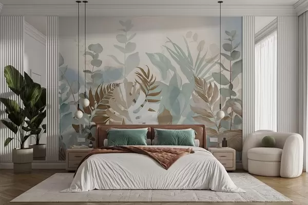 Fototapet Pastel plante ferigi, monstera și eucalipt, lumina texturat fundal, iluminat moale, pașnică , ilustrare botanică Nr. w09316v1