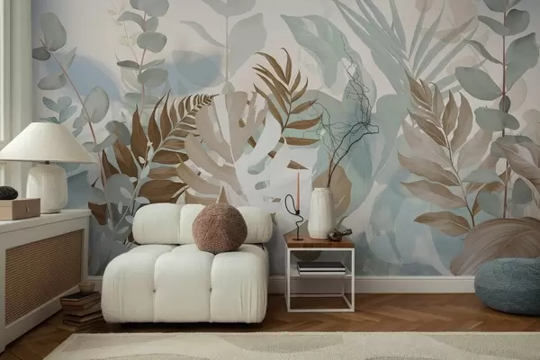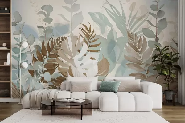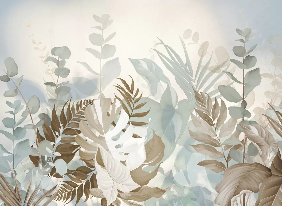 Fototapet Pastel plante ferigi, monstera și eucalipt, lumina texturat fundal, iluminat moale, pașnică , ilustrare botanică Nr. w09316v1