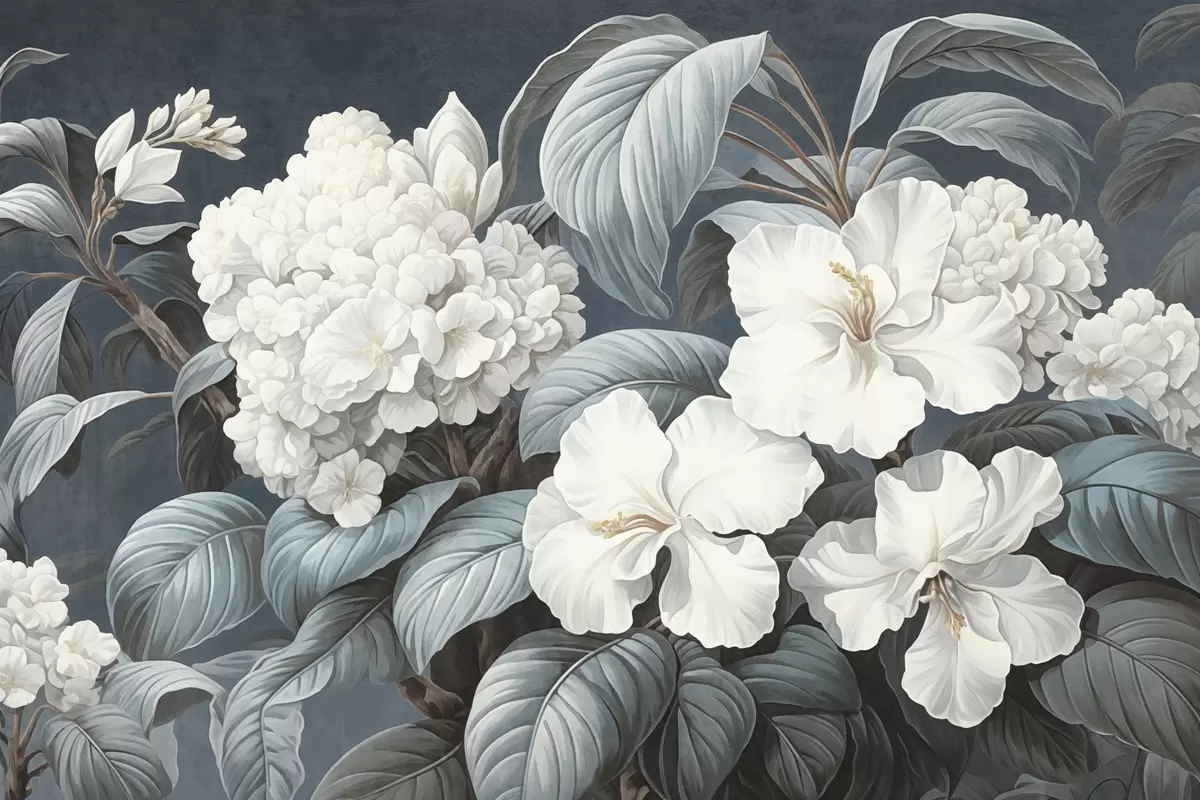 Fototapet Flori tropicale albe cu petale delicate și frunze pe un fundal albastru închis, stil vintage texturat, ilustrație botanică Nr. w09334