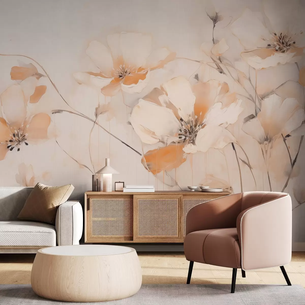 Fototapet Flori albe și portocalii texturate cu tulpini lungi, fundal deschis, culori moi, compoziție elegantă, tușe delicate Nr. w09335