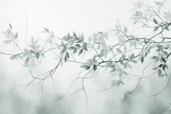 Fototapet Ramuri cu textură delicată, cu frunze de culoare gri și verde estompat, pe un fundal moale și neclar. Nr. w09336v1