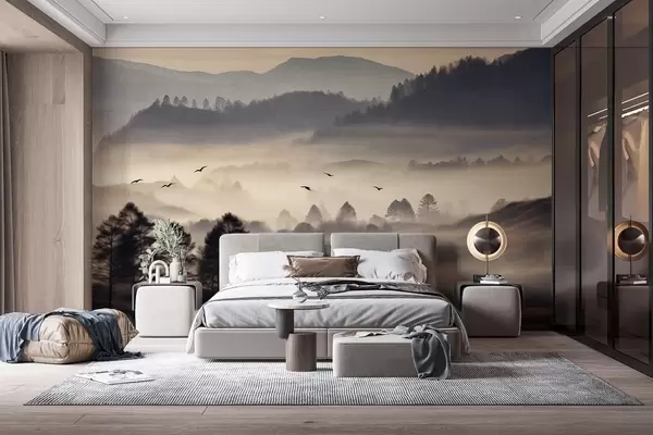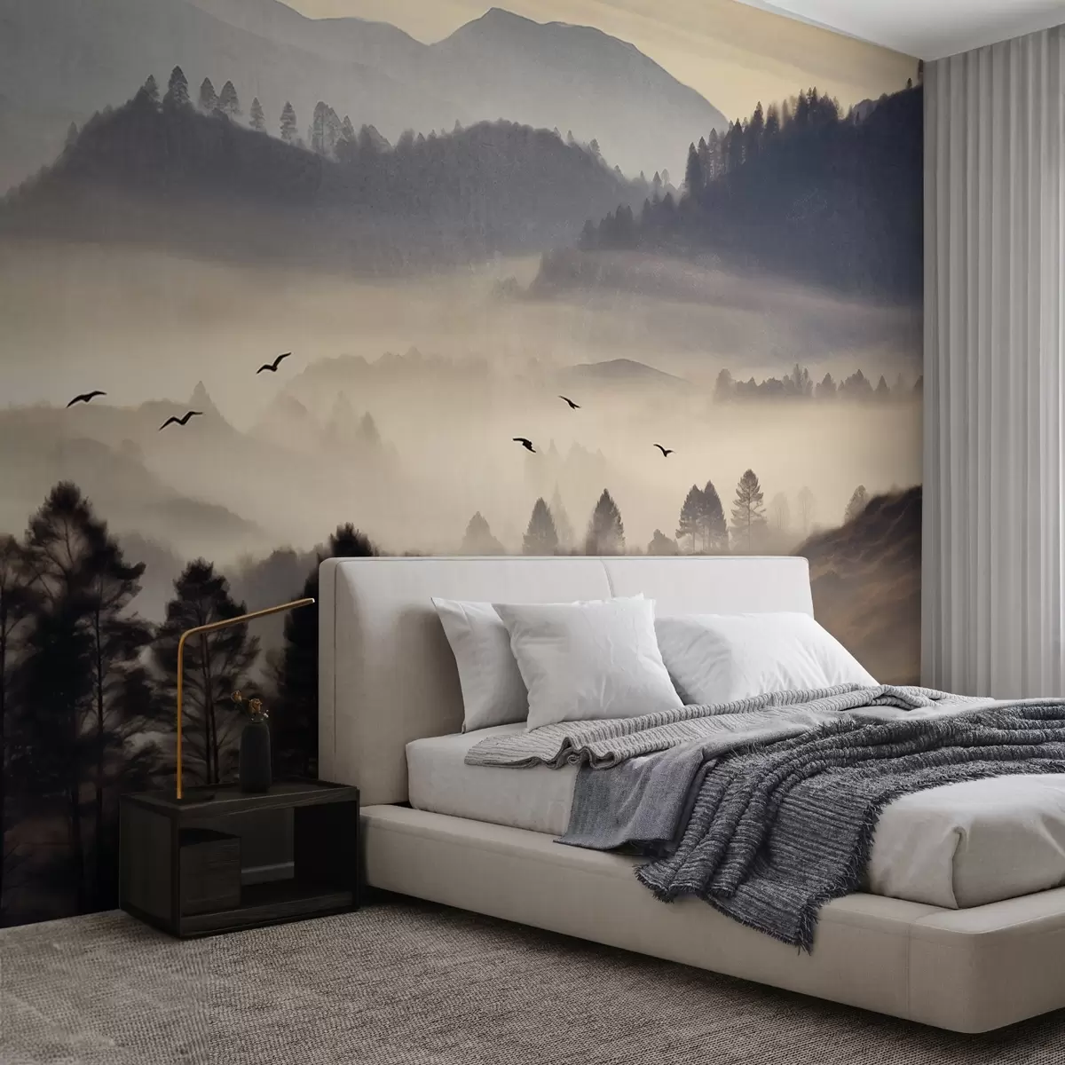 Fototapet Peisaj montan texturat cu straturi de ceață, copaci siluetați în prim-plan, lanț muntos îndepărtat, iluminare moale Nr. w09338