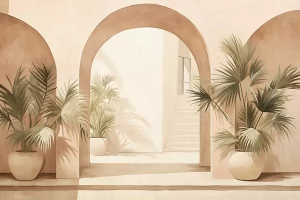Fototapet Arcuri texturate cu plante în ghiveci, paletă de culori bej deschis, design minimalist, scări în fundal Nr. w09339