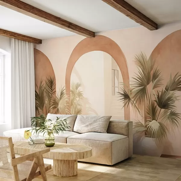 Fototapet Arcuri texturate cu plante în ghiveci, paletă de culori bej deschis, design minimalist, scări în fundal Nr. w09339