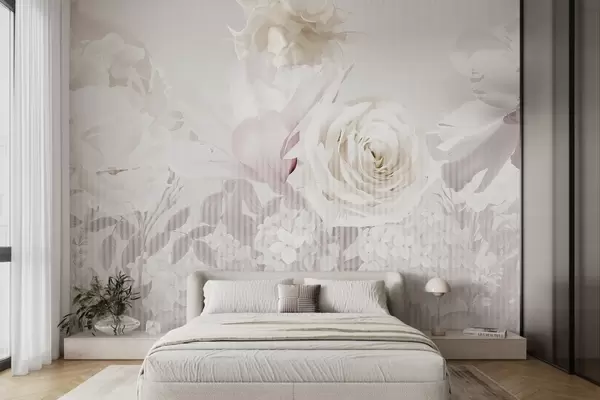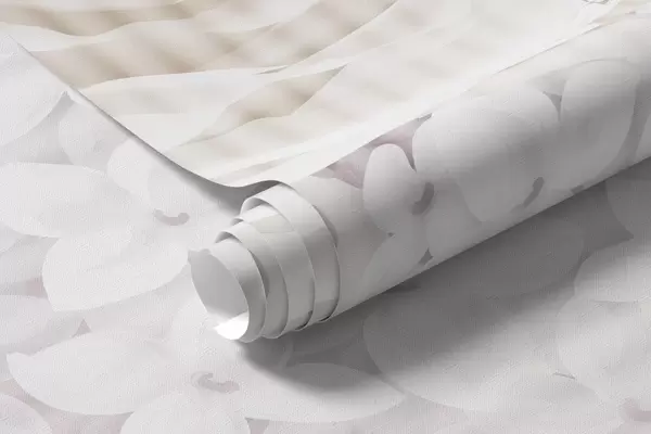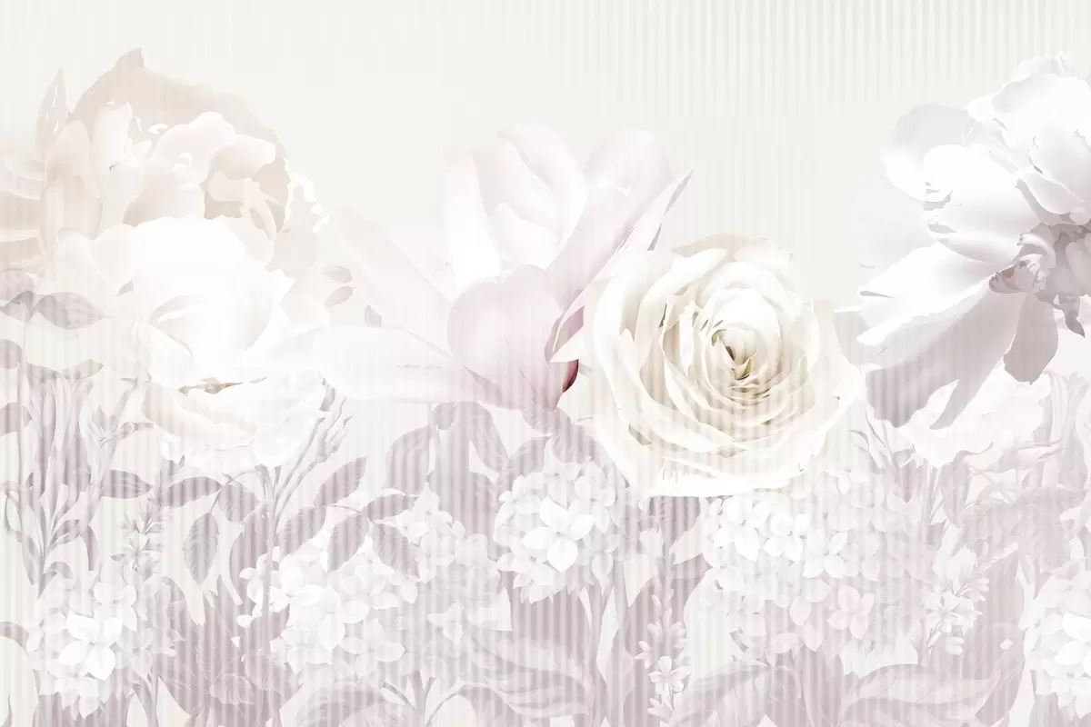 Fototapet Aranjament floral cu trandafiri, hortensii și lalele în nuanțe pastelate de alb, roz și bej, cu textură dungată Nr. w09340