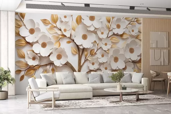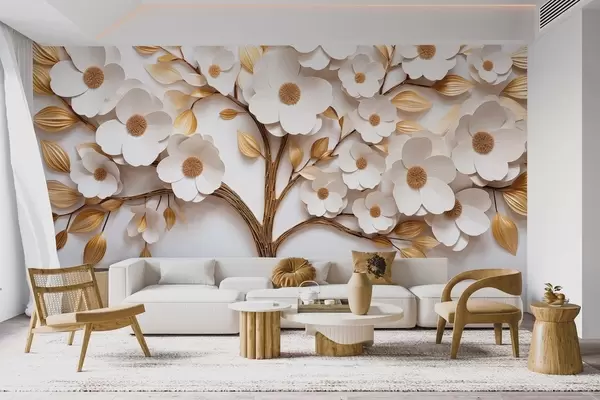 Fototapet Copac cu flori albe și imitație de frunze în relief Nr. w09348