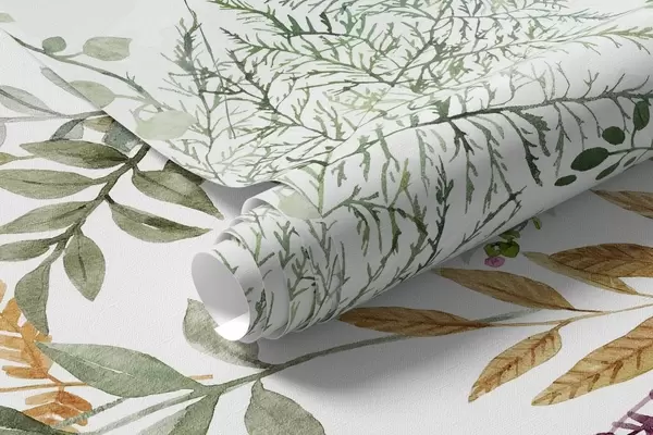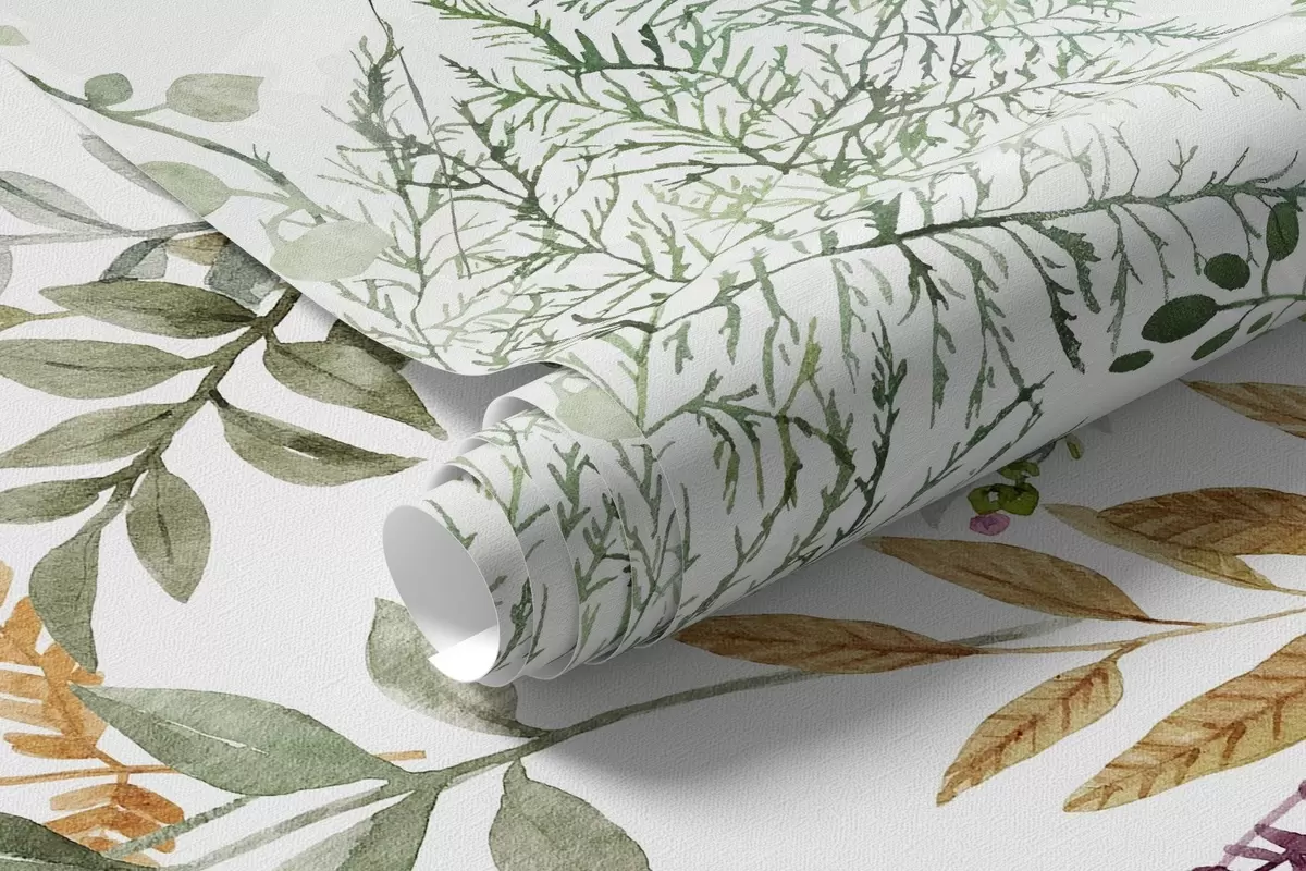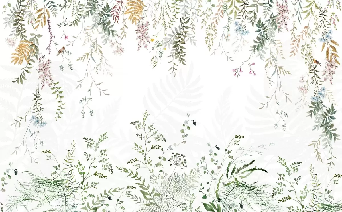 Fototapet Ilustrație botanică cu ferigi, iarbă și plante agățate, tonuri pastelate, pe fundal alb stil texturat acuarelă Nr. w09364