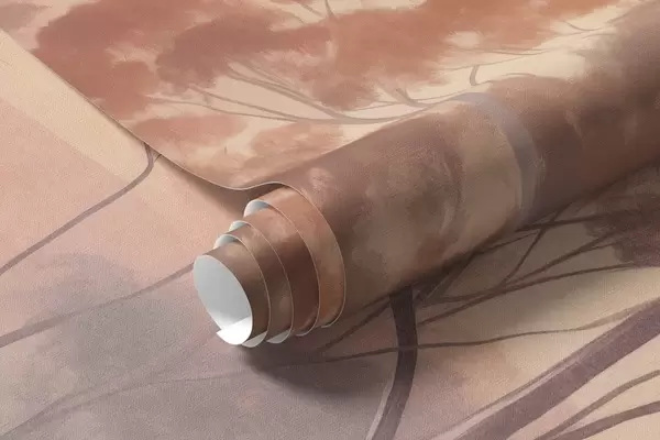 Fototapet Un peisaj cu copaci eucalipt într-un câmp cu pastel roz și portocaliu cer, o ceață ușoară, pictura stil texturat Nr. w09367