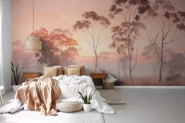 Fototapet Un peisaj cu copaci eucalipt într-un câmp cu pastel roz și portocaliu cer, o ceață ușoară, pictura stil texturat Nr. w09367