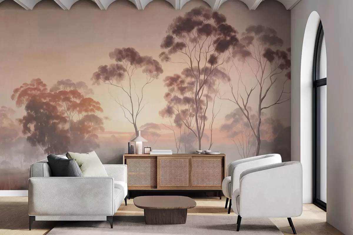 Fototapet Un peisaj cu copaci eucalipt într-un câmp cu pastel roz și portocaliu cer, o ceață ușoară, pictura stil texturat Nr. w09367