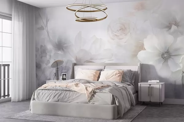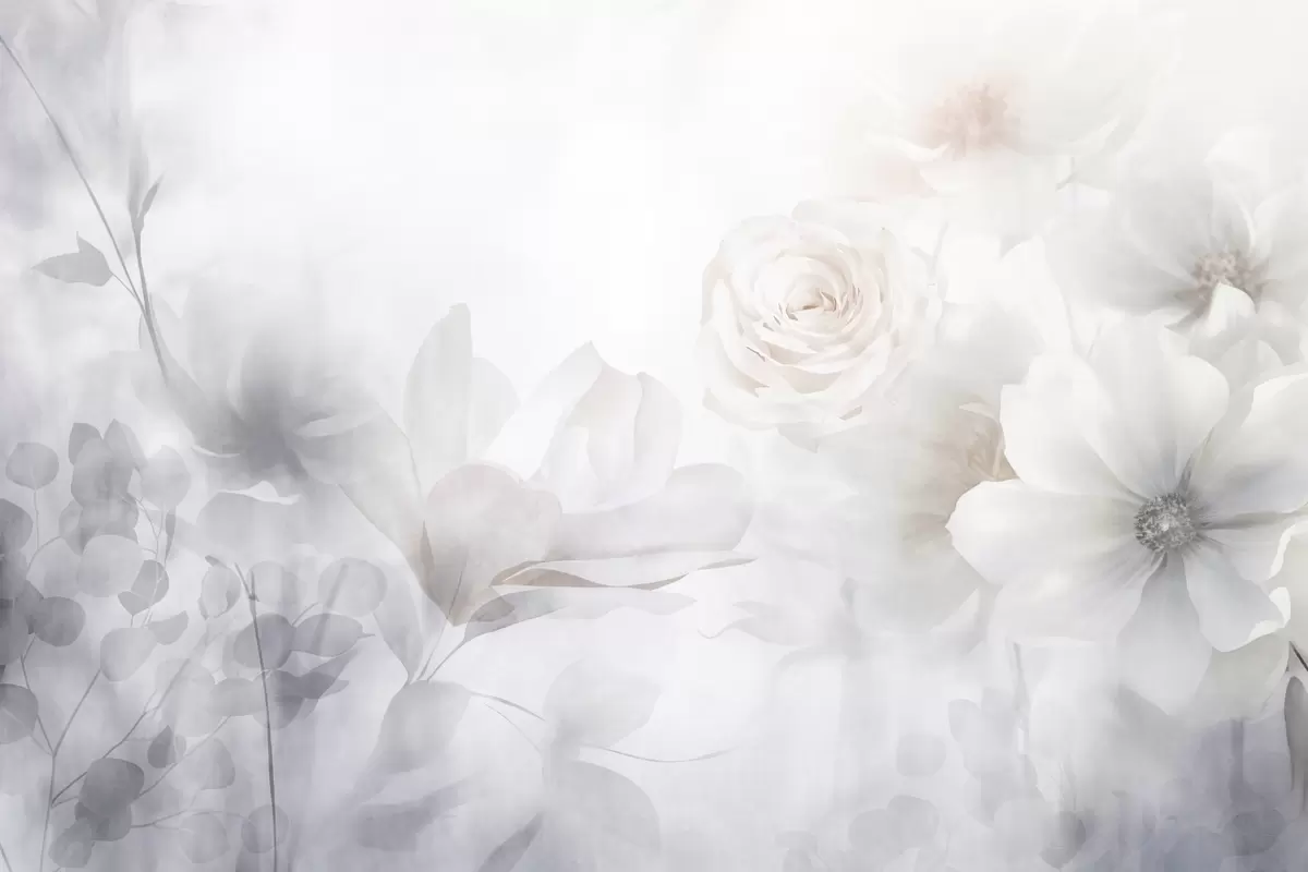 Fototapet Un aranjament floral abstract delicat cu trandafiri roz pastel și magnolii, focalizare moale, fundal gri deschis Nr. w09371
