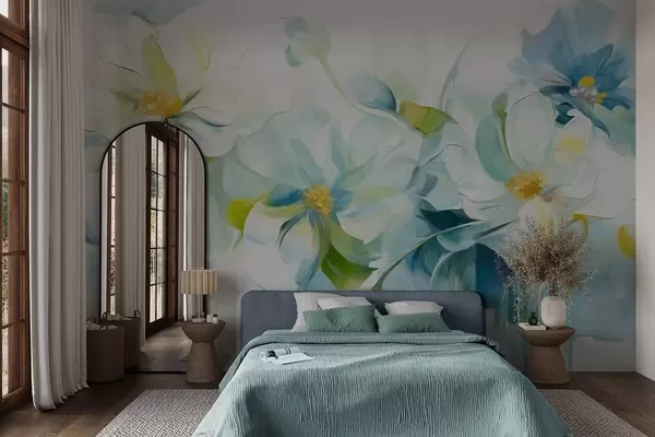 Fototapet Flori abstracte albe și albastre cu pistil galben și frunze verzi, pe un fundal alb, stil de pictură texturată Nr. w09372
