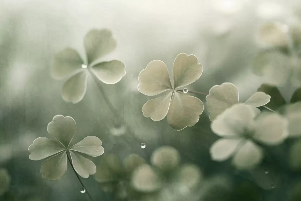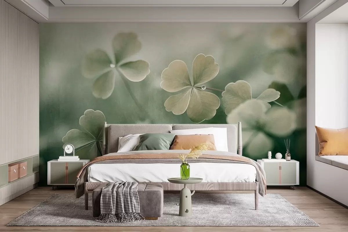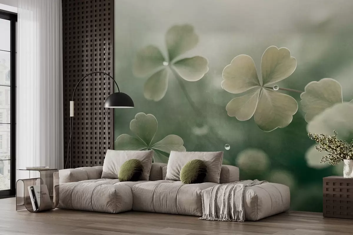 Fototapet Trifoi cu patru frunze cu picături de apă, culoare verde deschis, focalizare moale, fundal neclar, imprimare texturată Nr. w09376
