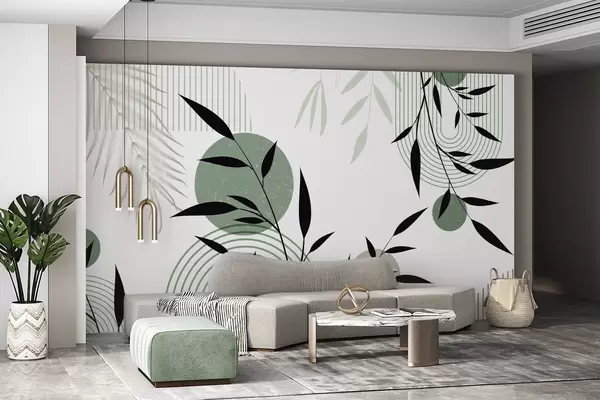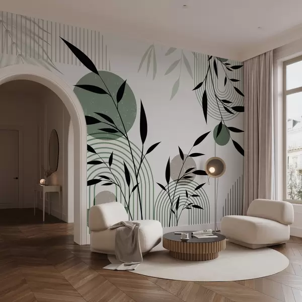 Fototapet Imprimare abstractă texturată cu forme geometrice, cercuri și arcuri și plante negre și verzi pe un fundal alb Nr. w09384