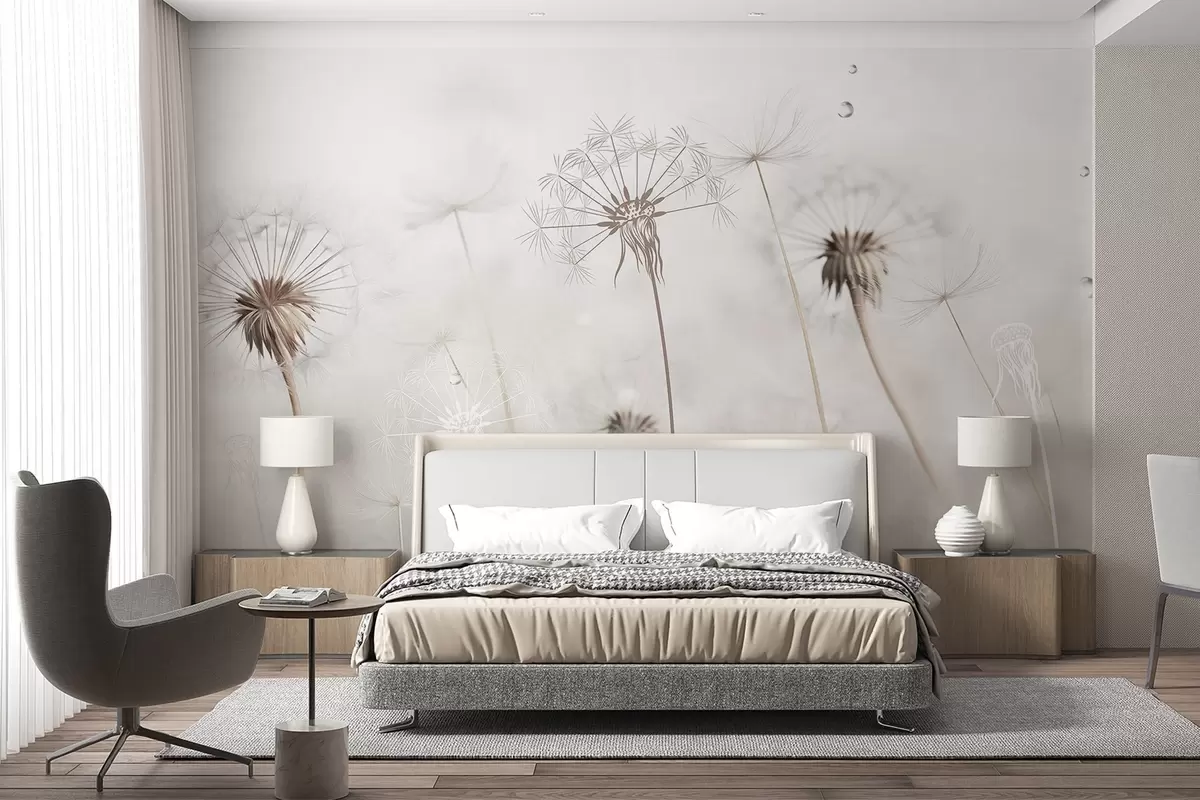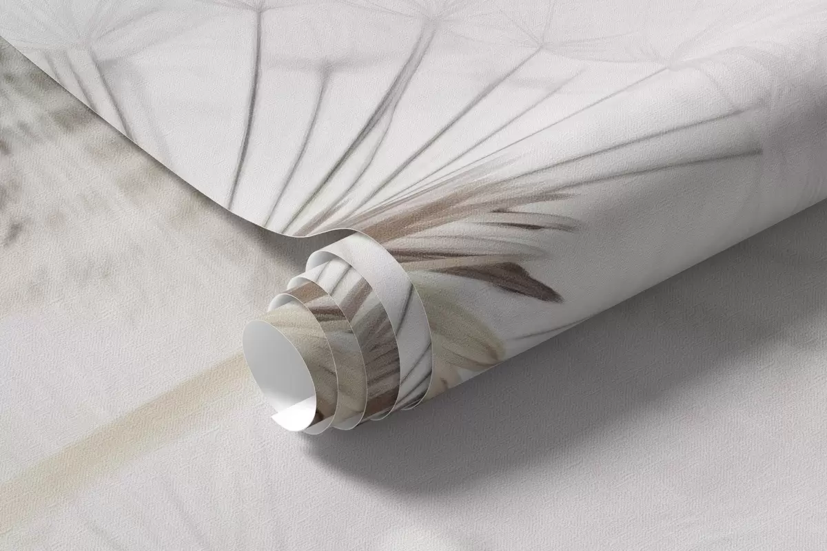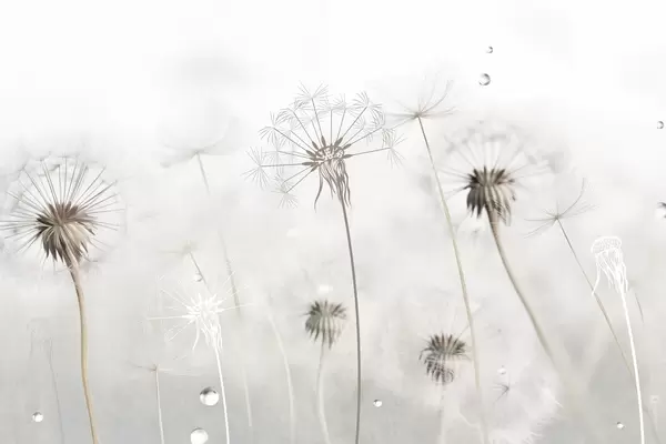 Fototapet Păpădii cu picături de apă, fundal alb, prim-plan, lumină difuză, natură, botanică, eterică, delicată, minimalistă Nr. w09399